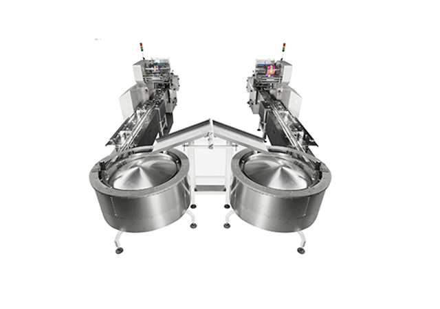 生產(chǎn)線上的物料輸送至圓盤內(nèi),通過旋轉將物料整理system后,完成高速包裝,生產(chǎn)能力300-450包/分鐘。